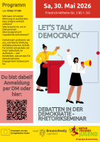 Lerne im Rhetorikseminar „Let’s Talk Democracy“, wie du deine Meinung überzeugend und respektvoll vertrittst. Gemeinsam probieren wir aus, wie Worte wirken und warum gute Kommunikation wichtig für demokratisches Engagement ist.